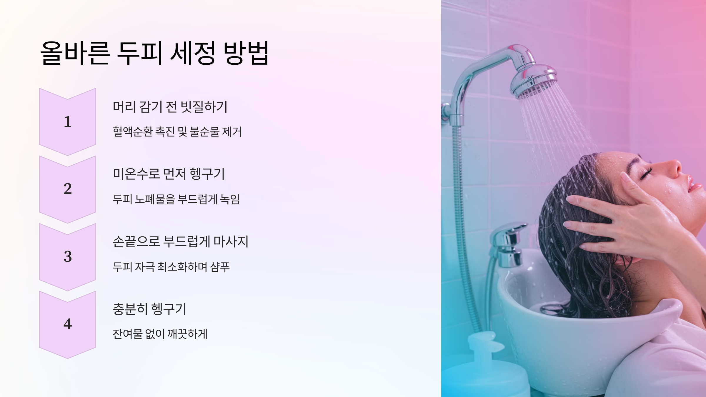 🔹 미지근한 물로 머리 감기 – 뜨거운 물은 두피를 건조하게 만듭니다. 🔹 샴푸 후 깨끗이 헹구기 – 잔여물이 남으면 두피 트러블의 원인이 됩니다.