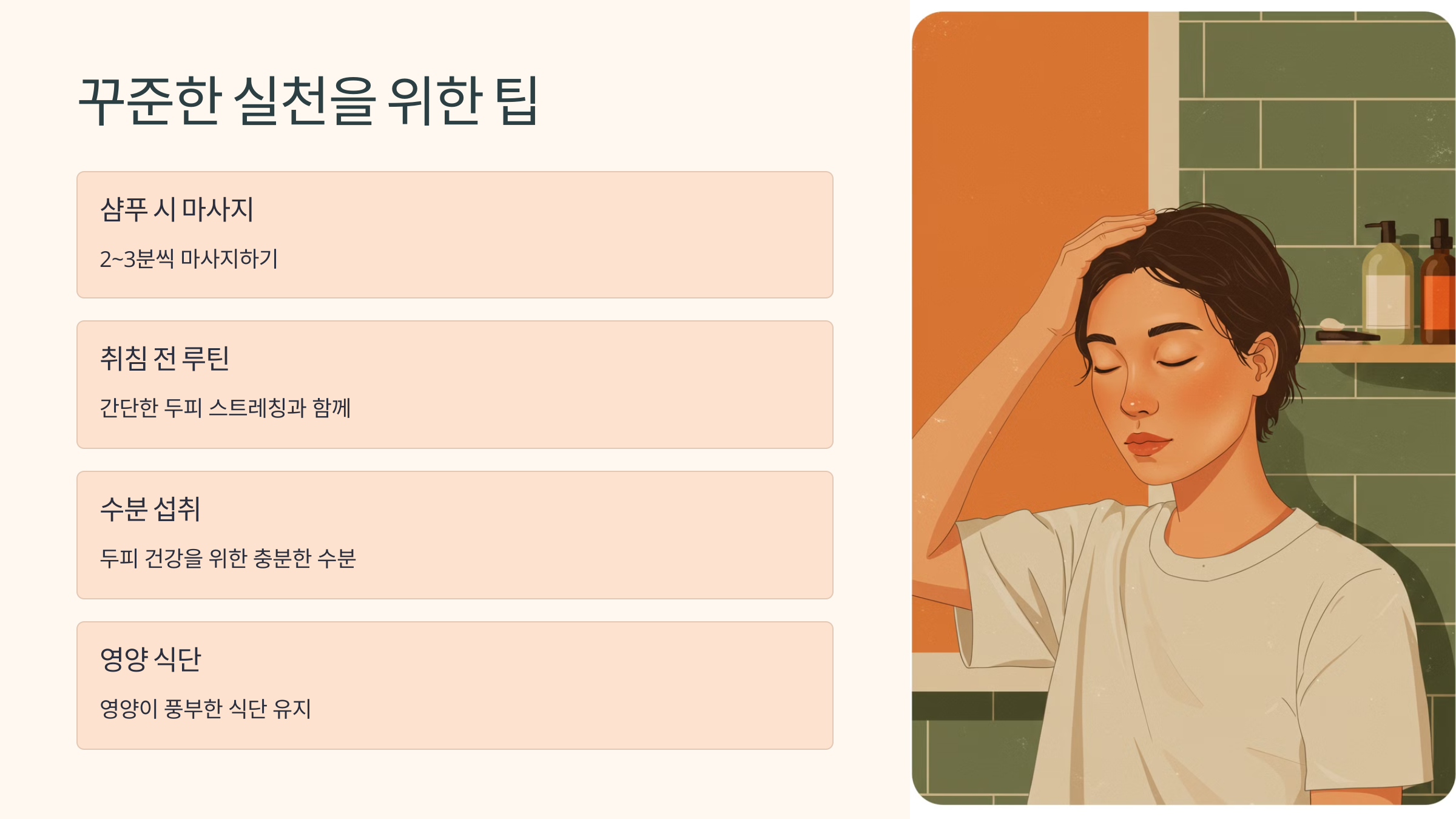 가벼운 손가락 터치부터 전문 마사지 도구까지 다양한 방법이 있으며, 꾸준히 하면 두피 건강과 모발 성장에 긍정적인 변화를 기대할 수 있습니다.