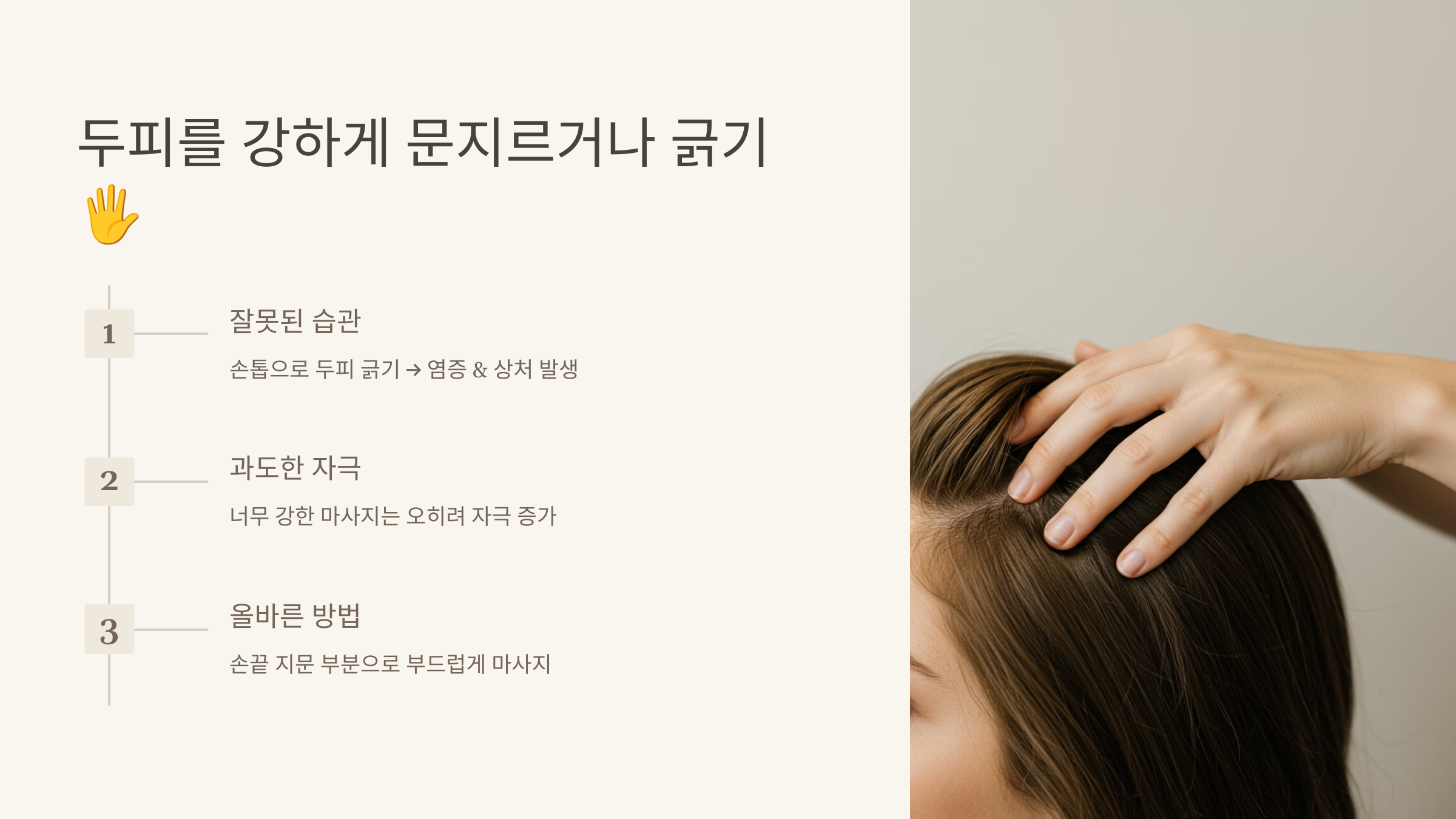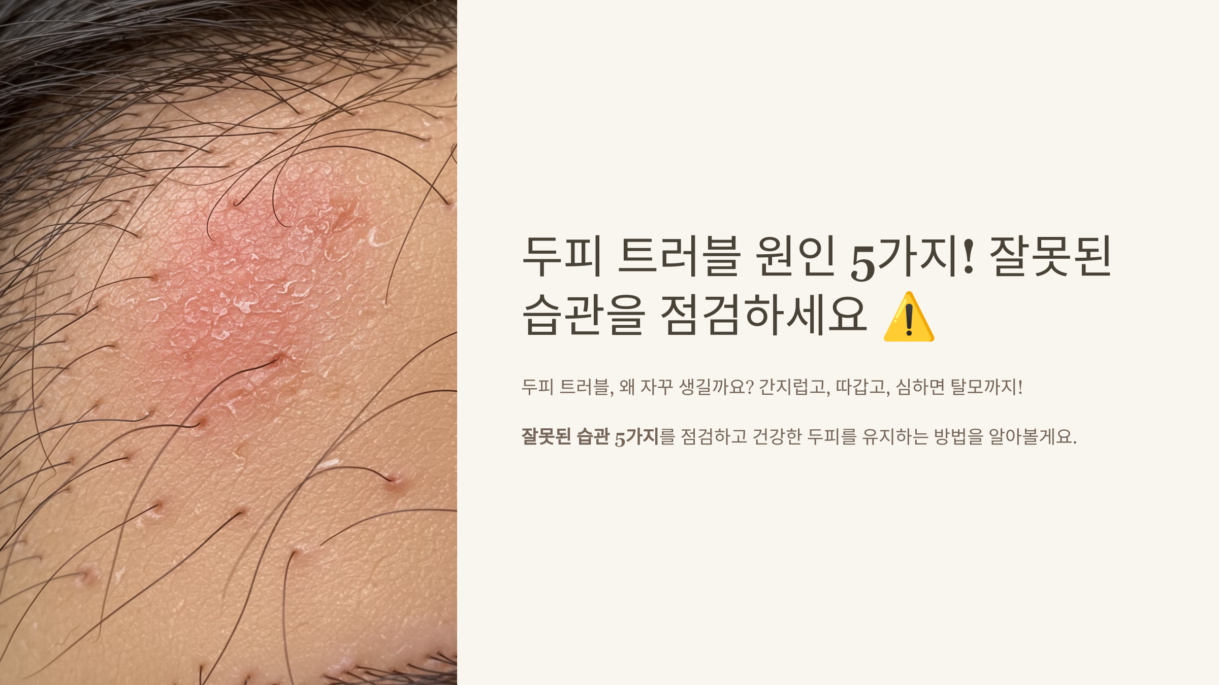 두피 트러블, 왜 자꾸 생길까요? 🤔 간지럽고, 따갑고, 심하면 탈모까지! 두피 건강을 해치는 잘못된 습관 5가지를 점검하고 건강한 두피를 유지하는 방법을 알아볼게요.
