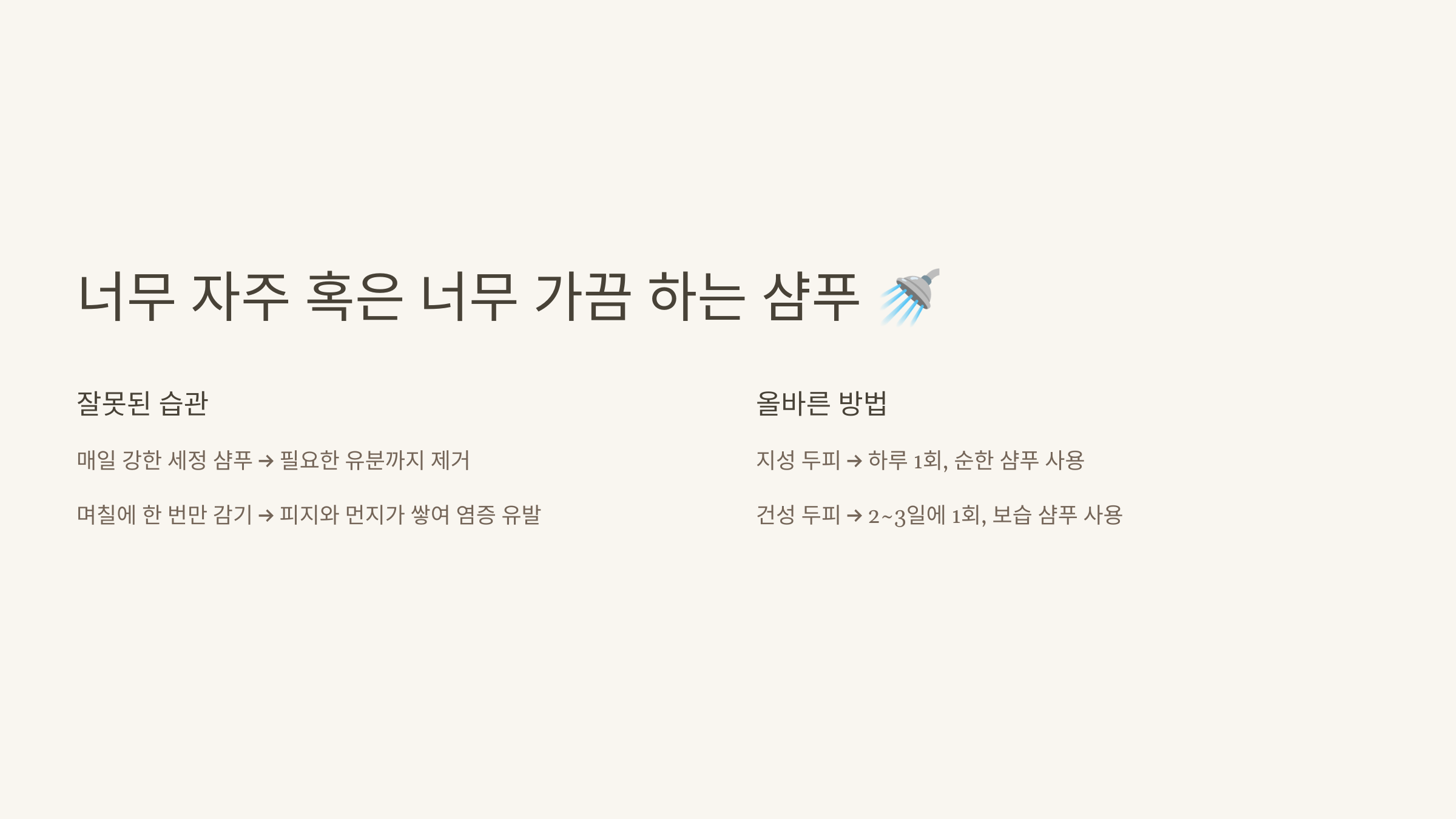 - 건성 두피 → 2~3일에 1회, 보습 샴푸 사용