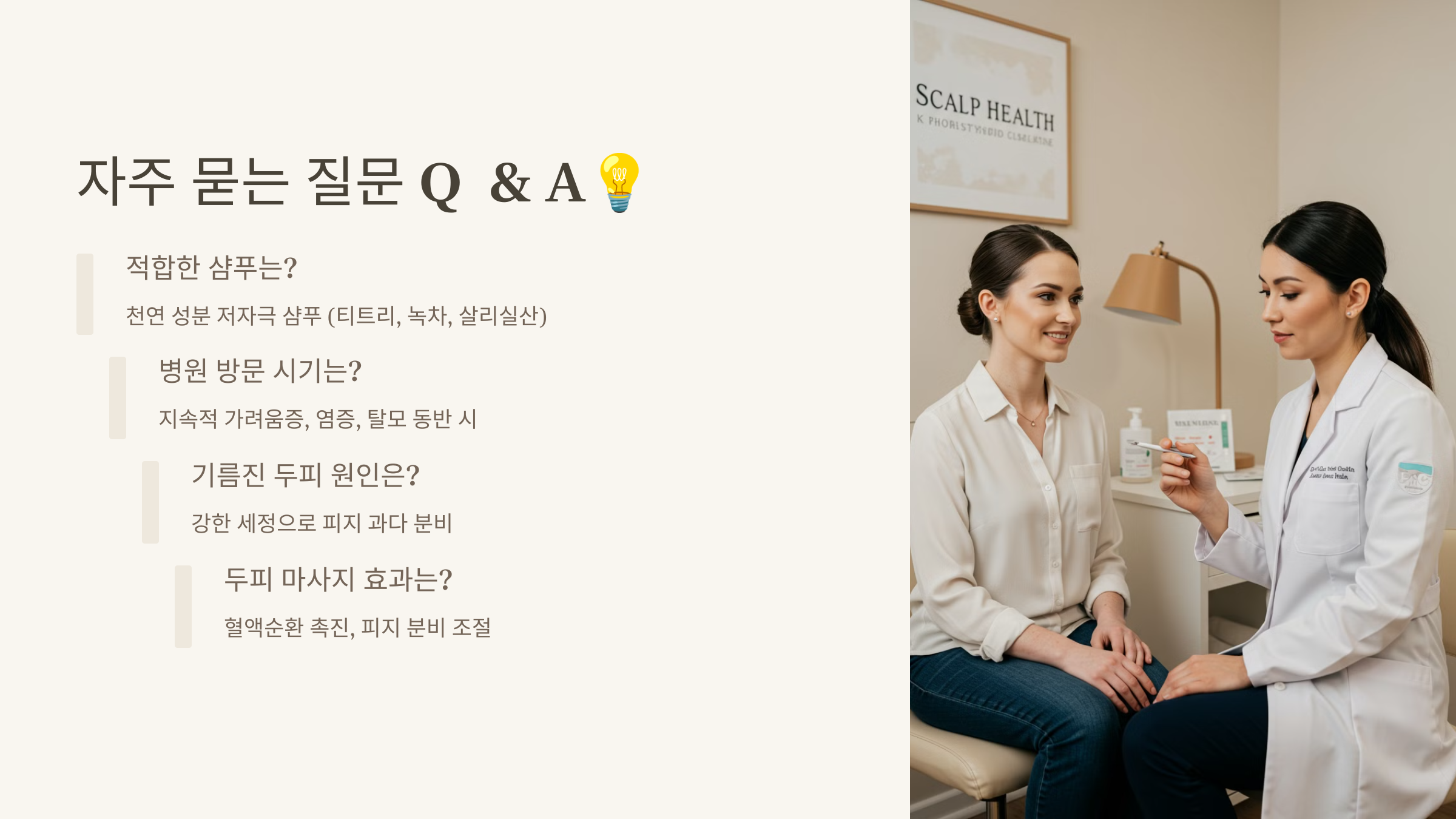 네! 가벼운 두피 마사지는 혈액순환을 촉진하고 피지 분비를 조절하는 데 효과적이에요. 하지만 너무 강하게 하면 오히려 자극이 될 수 있으니 주의하세요.