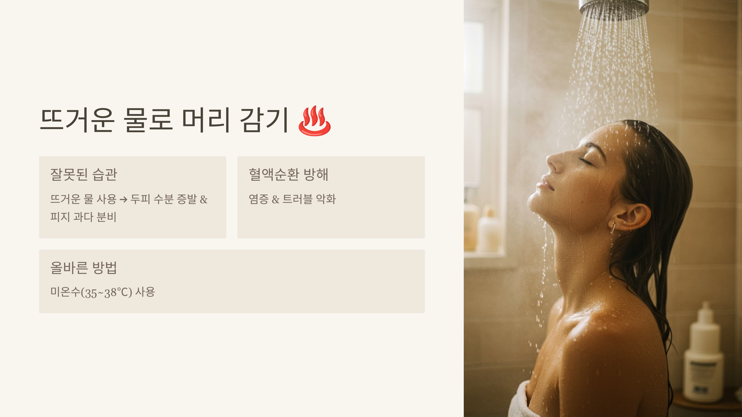 - 뜨거운 물 사용 → 두피 수분 증발 & 피지 과다 분비