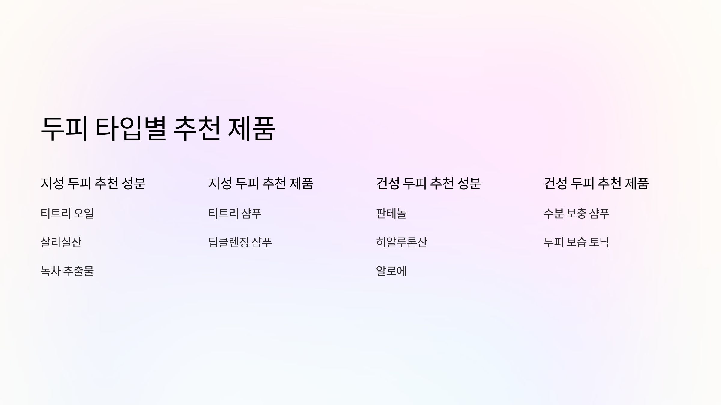 | 건성 두피 | 판테놀, 히알루론산, 알로에 | 수분 보충 샴푸, 두피 보습 토닉 |