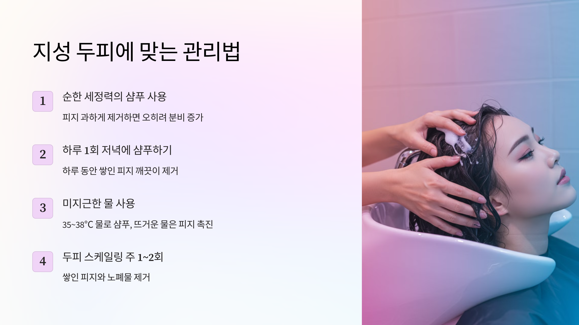✅ 순한 세정력의 샴푸 사용 → 피지를 과하게 제거하면 오히려 피지 분비 증가