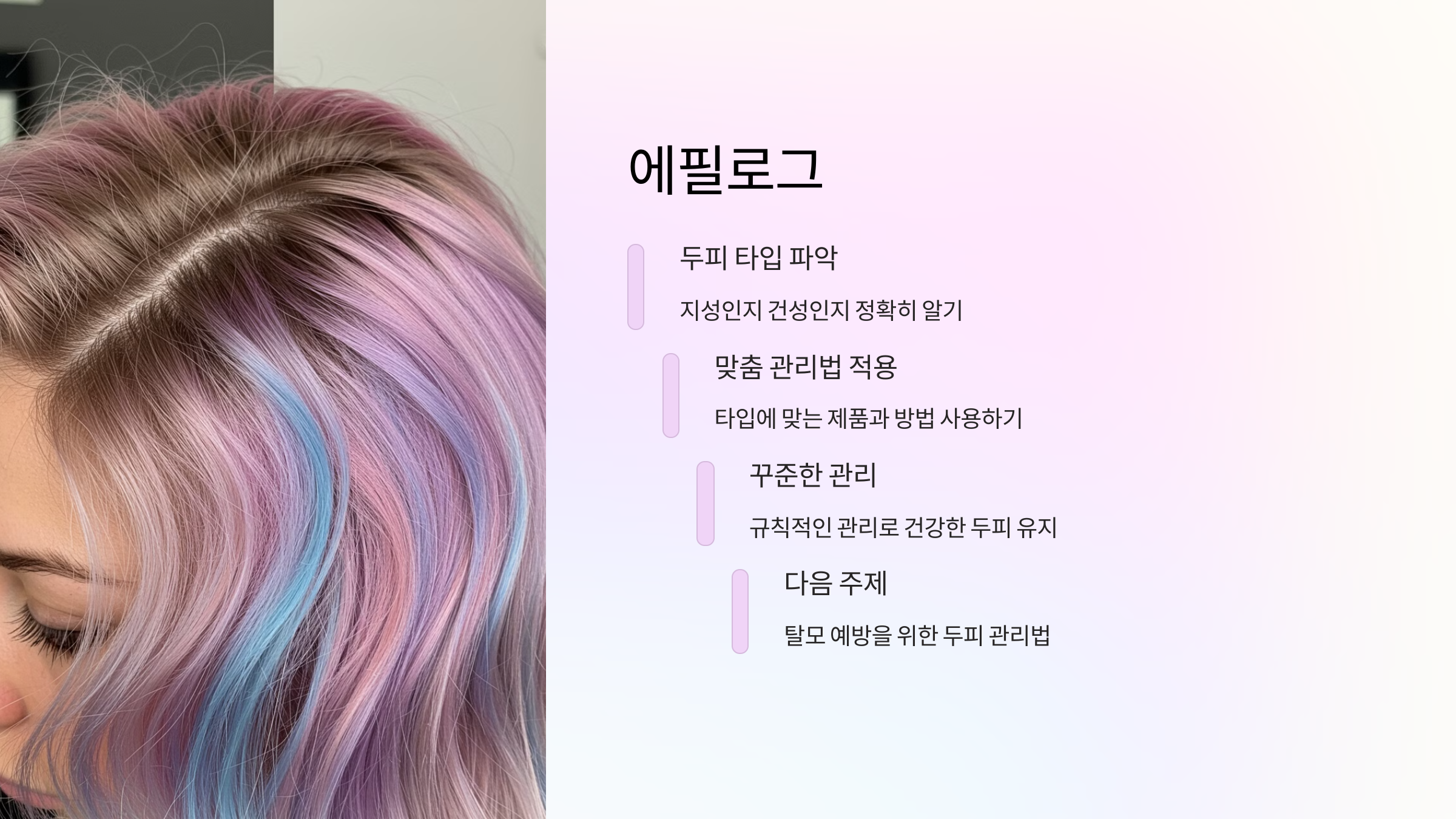 두피 건강은 모발 건강의 기본! 내 두피 타입을 정확히 알고 맞춤 관리하는 것이 중요해요. 꾸준한 관리로 건강한 두피를 유지해 보세요. 다음에는 탈모 예방을 위한 두피 관리법을 다뤄볼게요! 💙