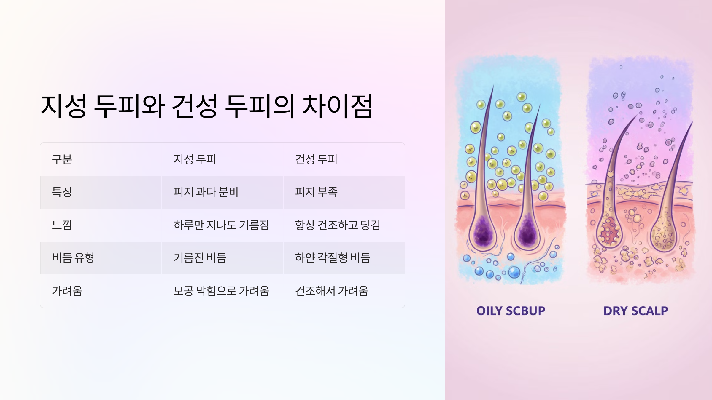 지성 두피와 건성 두피는 피지 분비량과 유수분 밸런스에서 큰 차이를 보여요.