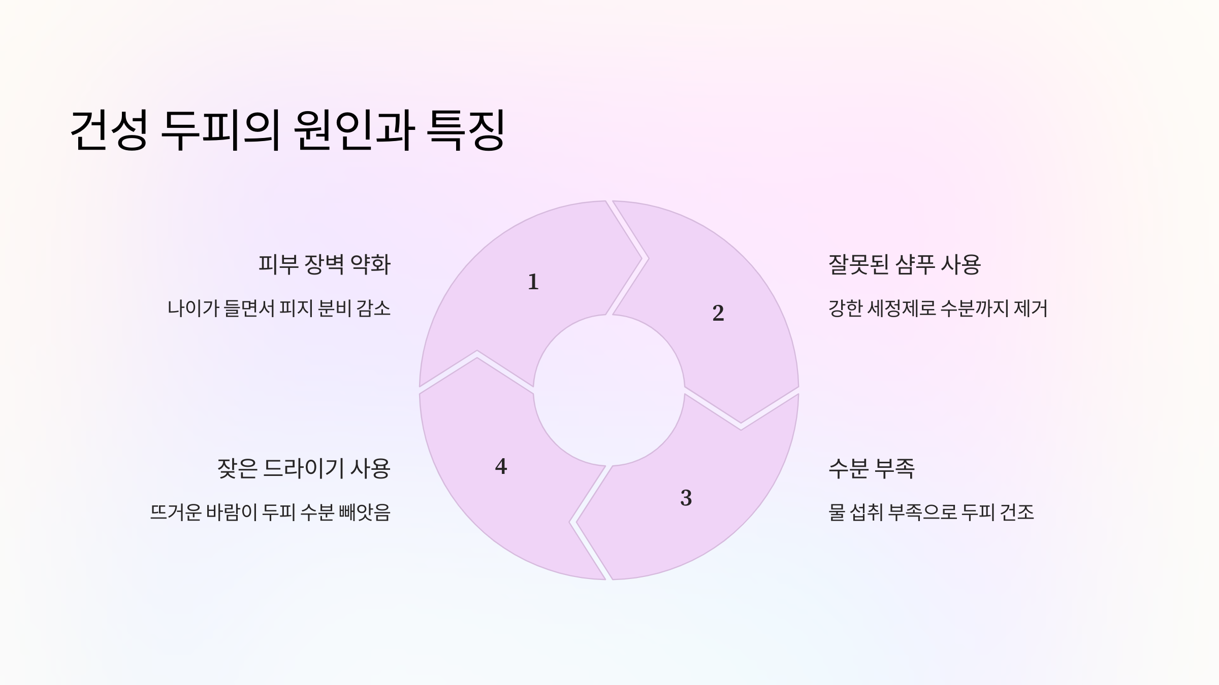 - 수분 부족: 물 섭취 부족으로 두피 건조