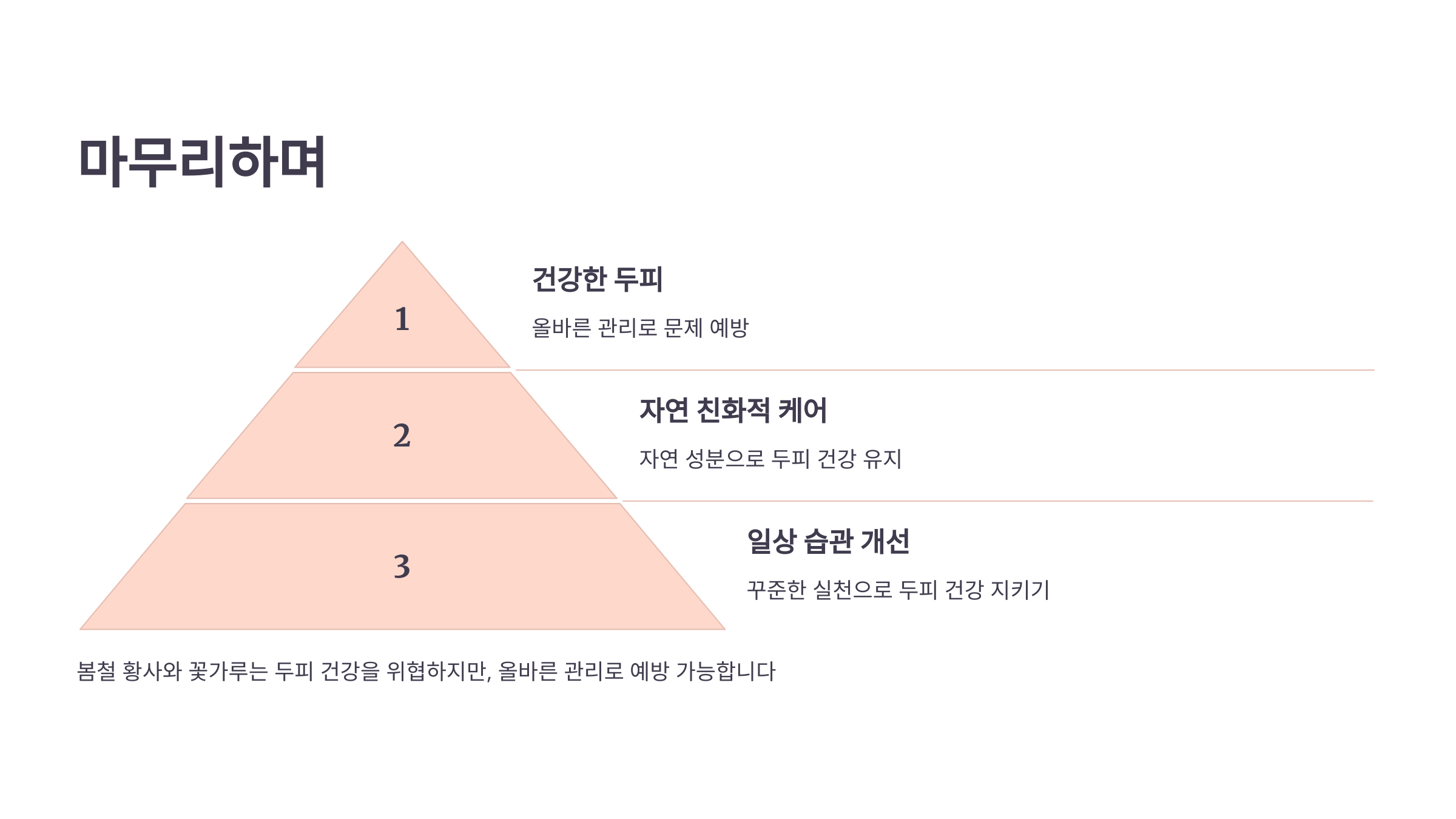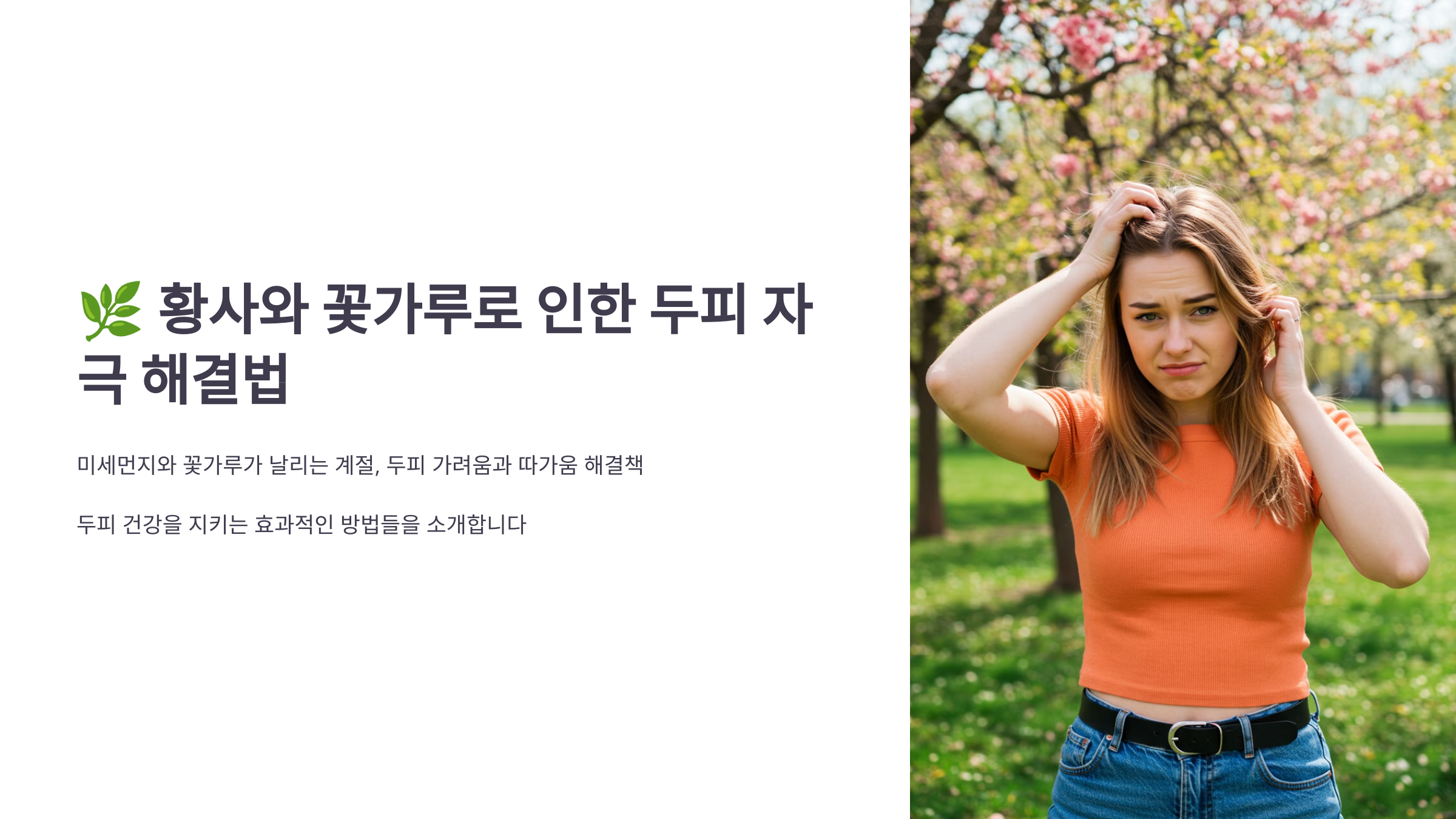 봄철 황사와 꽃가루는 두피 건강을 위협할 수 있지만, 올바른 관리 방법을 실천하면 문제를 예방할 수 있어요. 자연 친화적인 케어 방법을 통해 두피 건강을 지켜보세요!