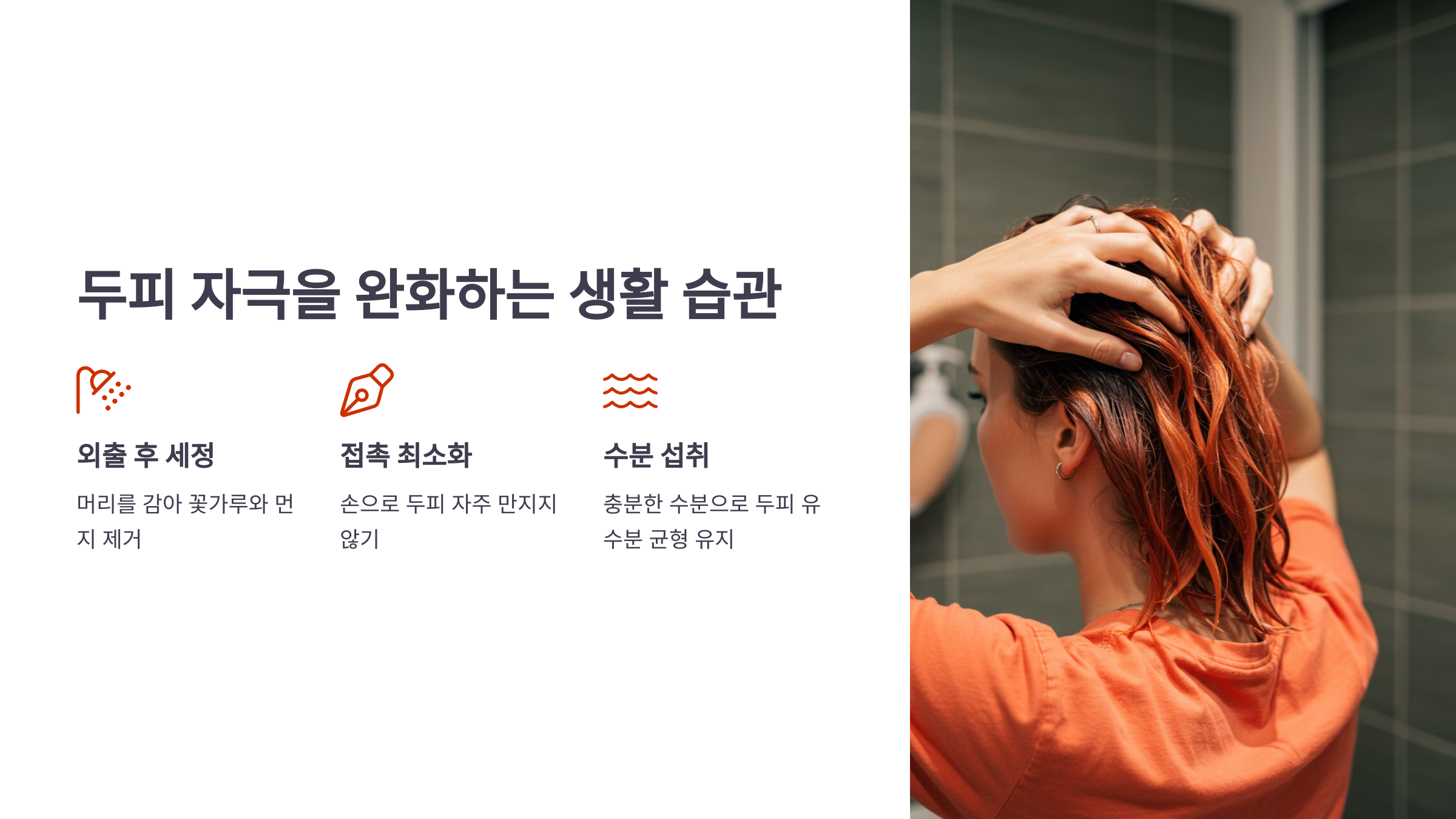 ✅ 외출 후에는 반드시 머리를 감아 꽃가루와 먼지를 제거하세요.