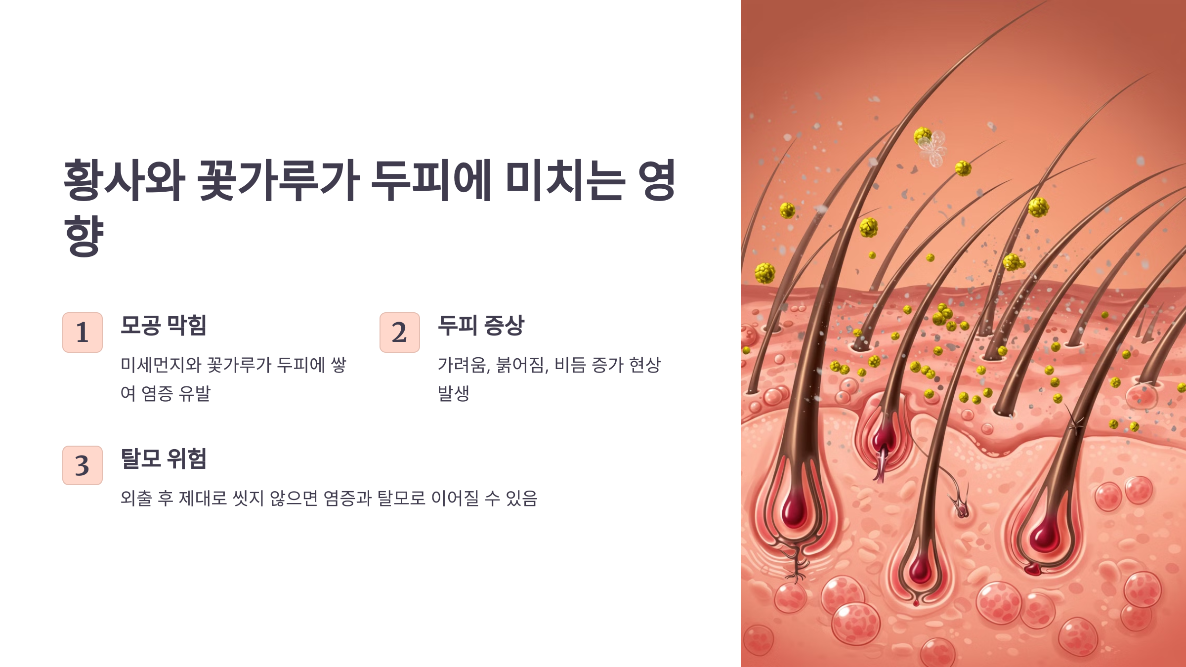 황사와 꽃가루는 두피 건강을 위협하는 주요 원인 중 하나예요. 공기 중 떠다니는 미세먼지와 꽃가루가 두피에 쌓이면 모공을 막아 염증을 유발할 수 있죠. 특히, 봄철에는 두피 가려움, 붉어짐, 비듬 증가 등의 증상이 나타나기 쉬워요.