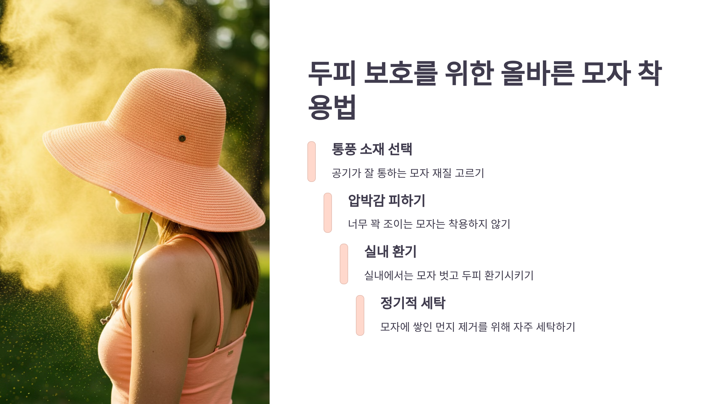 황사가 심한 날에는 모자를 써서 두피를 보호하는 것도 좋은 방법이에요. 하지만 잘못된 모자 착용은 오히려 두피 건강을 해칠 수 있어요.