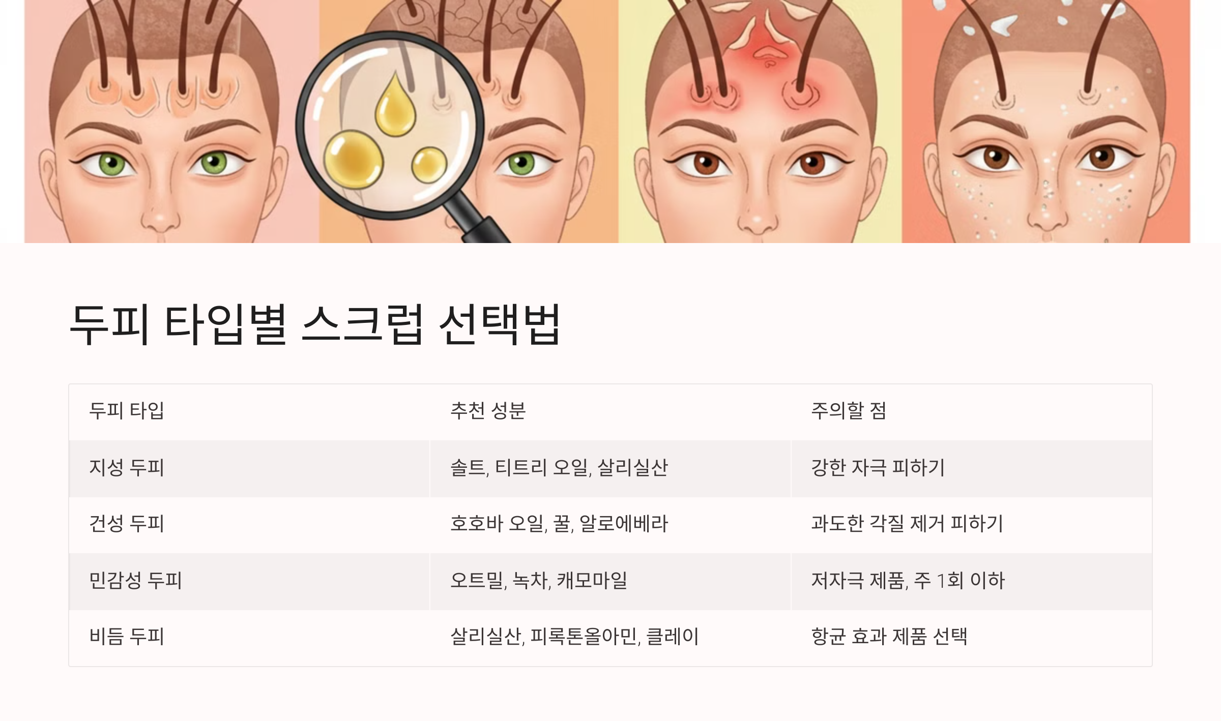 | 건성 두피 | 호호바 오일, 꿀, 알로에베라 | 과도한 각질 제거를 피할 것 |